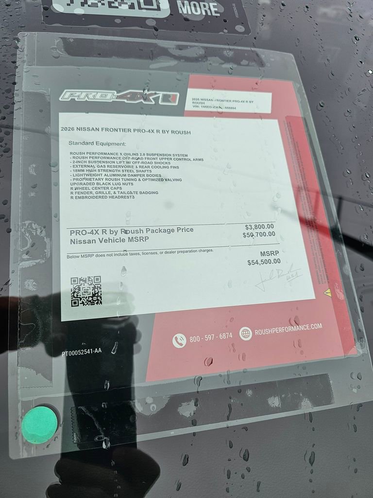 [R01] PRO-4X R (ROUSH) PACKAGE -inc: Leather Shift Knob, Unique Color for Grille Inserts & Skid Plate, [P01] PRO PREMIUM PACKAGE -inc: Auto-Dimming Mirror, Nissan Door-to-Door Navigation, Traffic Sign Recognition (TSR), Fender Premium Audio System w/10 Speakers, dual subwoofer, Partial Under-Seat Storage Delete, HomeLink UGDO, Auto-Tilt & Slide Sunroof w/Manual Shade, [K04] PRO-4X CONVENIENCE PACKAGE -inc: Bed Under-Rail Lighting, Remote Engine Starter, 120V Power Outlet in Bed, Heated Front Seats, Intelligent Around View Monitor (I-AVM), Moving Object Detection (MOD) and enhanced off-road mode, Utili-Track System, 2 adjustable tie-down cleats, Spray-In Bedliner, Trailer Hitch w/Wiring Harness, Heated Steering Wheel, Wireless Charging for Personal Devices, Heated Outside Mirrors, 120V Power Outlet in Rear Center Console , [F92] ELECTRONIC TAILGATE LOCK, [E10] PREMIUM PAINT, [B93] OFF-ROAD STYLE STEP RAILS, [B08] MUD FLAPS, Wireless Phone Connectivity, Wheels: 17" Off-Road Alloy, Wheels w/Locks.
