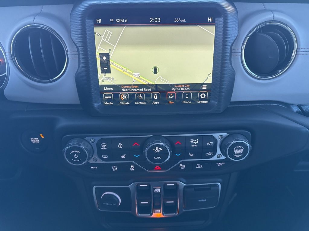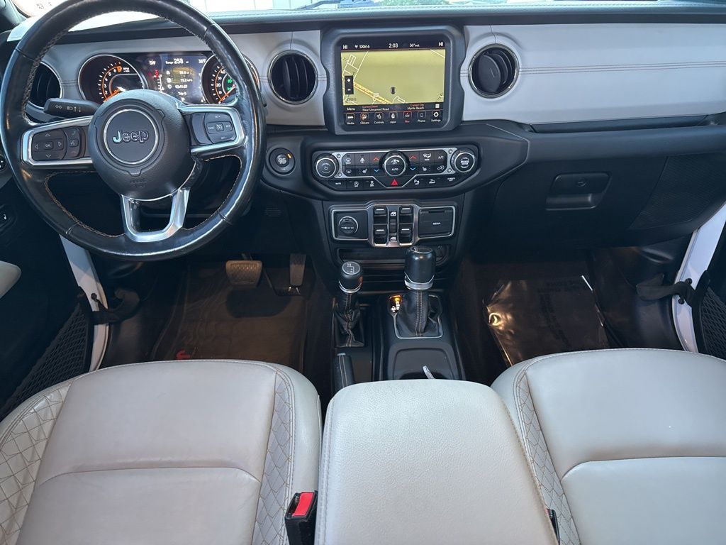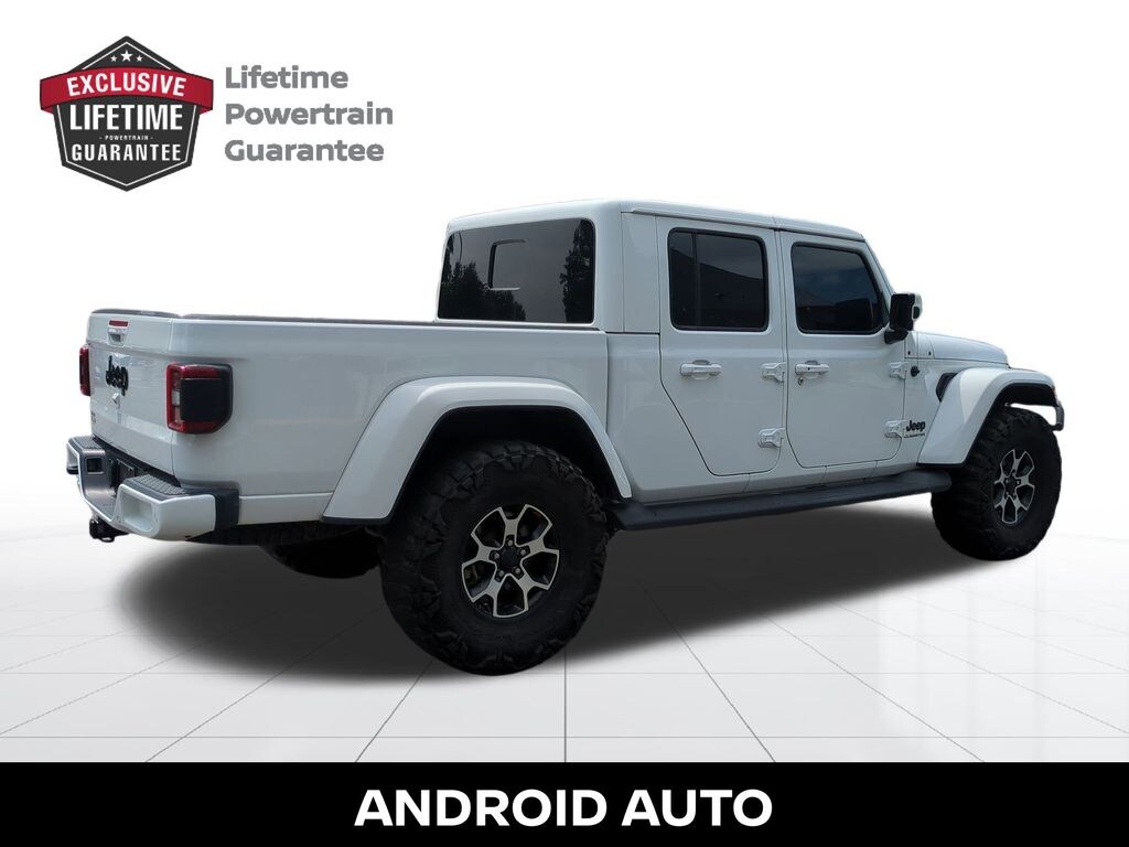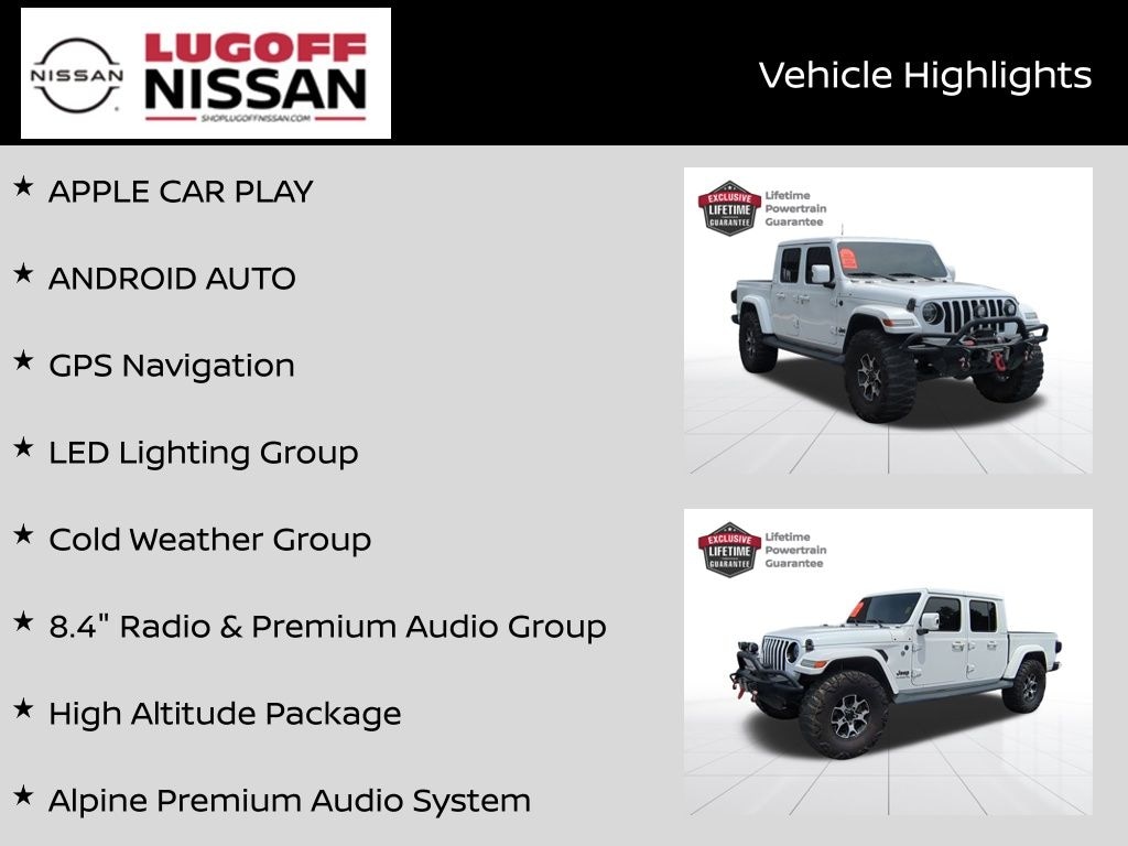 TRANSMISSION: 8-SPEED AUTOMATIC (850RE) -inc: Tip Start, Transmission Skid Plate, Selec-Speed Control (STD), REMOTE START SYSTEM, QUICK ORDER PACKAGE 24N HIGH ALTITUDE -inc: Engine: 3.6L V6 24V VVT UPG I w/ESS, Transmission: 8-Speed Automatic (850RE), Dana M210 Wide Front Axle, Leather Wrapped Shift Knob, High Altitude Package, Body-Color Door & Tailgate Handles, Sport Front Shock Absorbers, Body Color Grille w/Gloss Black Rings, Body Color Front Bumper, Body Color Rear Bumper w/Step Pads, Rear Armrest w/Cupholder Seat, Freedom Panel Storage Bag, Rear Window Defroster, Rear Sliding Window, No Soft Top, SiriusXM Traffic Plus, HD Radio, Rear View Auto Dim Mirror, For Details, Visit DriveUconnect.com, 1-Year SiriusXM Guardian Trial, 5-Year SiriusXM Travel Link Service, GPS Navigation, 5-Year SiriusXM Traffic Service, SiriusXM Travel Link, Emergency/Assistance Call, 8.4" Touchscreen Display, ParkSense Rear Park Assist System, Blind Spot & Cross Path Detection, Sport Rear Shock Absorbers, Caramel Interior Accents, Wrapped I/P Bezel w/Caramel Stitch, Daytime Running Lamps LED Accents, LED Park Turn Lamps, Front LED Fo, GVWR: 5,800 LBS (STD), ENGINE: 3.6L V6 24V VVT UPG I W/ESS (STD), BRIGHT WHITE CLEARCOAT, BODY COLOR 3-PIECE HARD TOP -inc: Freedom Panel Storage Bag, Rear Window Defroster, Rear Sliding Window, No Soft Top, ANTI-SPIN DIFFERENTIAL REAR AXLE, Wheels: 20" x 8" Gloss Black Aluminum, Voice Activated Dual Zone Front Automatic Air Conditioning. This Jeep Gladiator has a dependable Regular Unleaded V-6 3.6 L/220 engine powering this Automatic transmission.